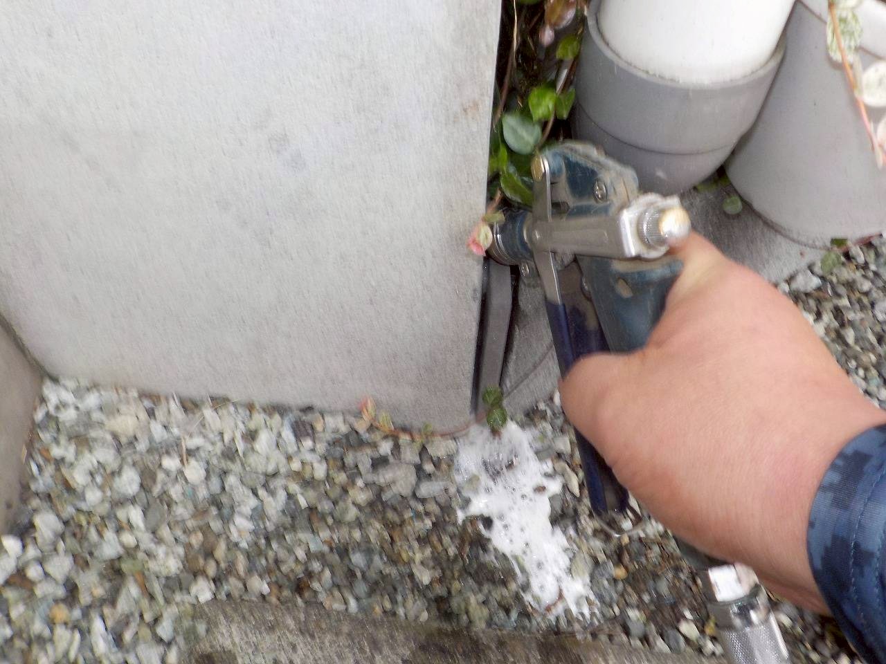 玄関の土間コンクリートの下や、ユニットバスの下には侵入が出来ませんので、外壁等に小さな穴をあけて、必要箇所に薬剤を注入します。